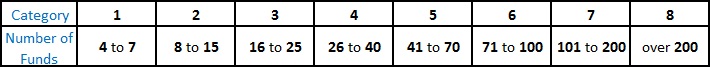 Chaque société européenne de gestion d'actifs disposant d'un fonds est notée. Afin de créer des groupes cohérents, les catégories sont définies par le nombre de fonds notés.