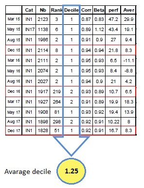 - Un fonds qui figure dans les 12 derniers classements trimestriels basée sur des performances annuelles obtient une note égale à son décile moyen