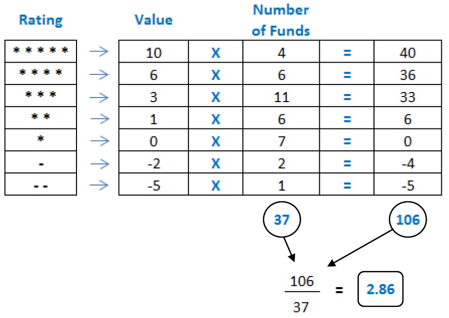 - Nous considérons l’ensemble des fonds notés d’une société de gestion pour calculer la note moyenne pondérée: